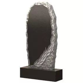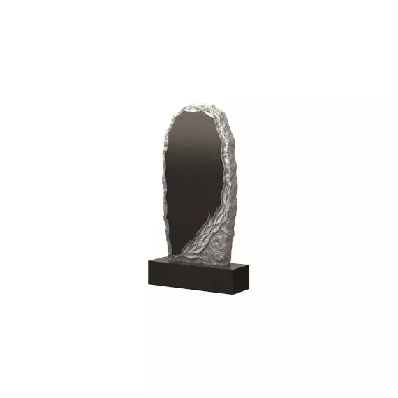 Довольно необычная и интересная форма памятника. Вытянутая овальная стела обрамлена по всему своему периметру ломанной резной коркой, которая задает эффект некоторой колкости и остроты силуэта модели. Такая резкость и легкая небрежность боковых граней сглаживается резным узором изящно изогнутой ветки дерева, расположенной ближе к основанию памятника. Она акцентирует на себе внимание, отвлекая от общей композиции сооружения. Надгробие такой формы будет красивым и оригинальным оформлением места захоронения, где покоится родной и горячо любимый человек.