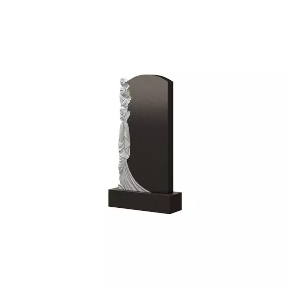 Изображенный памятник можно образно подлить на две части. Основная — стандартная стела с прямой боковой гранью и слегка округленной верхней. От классчисеких моделей надгробие отличает вторая боковая грань, полностью заполненная резными элементами. В верхней части четыре розы, которые плавно переходять в ниспадающию материю. Такой декор придает особенный, изящный вид, делает изделие не просто привлекательным, действительно красивым. Оформление занимет небольшой по площади отрезок на поверхности памятника, что позволяет сконцентрировать внимание на информации об умершем.