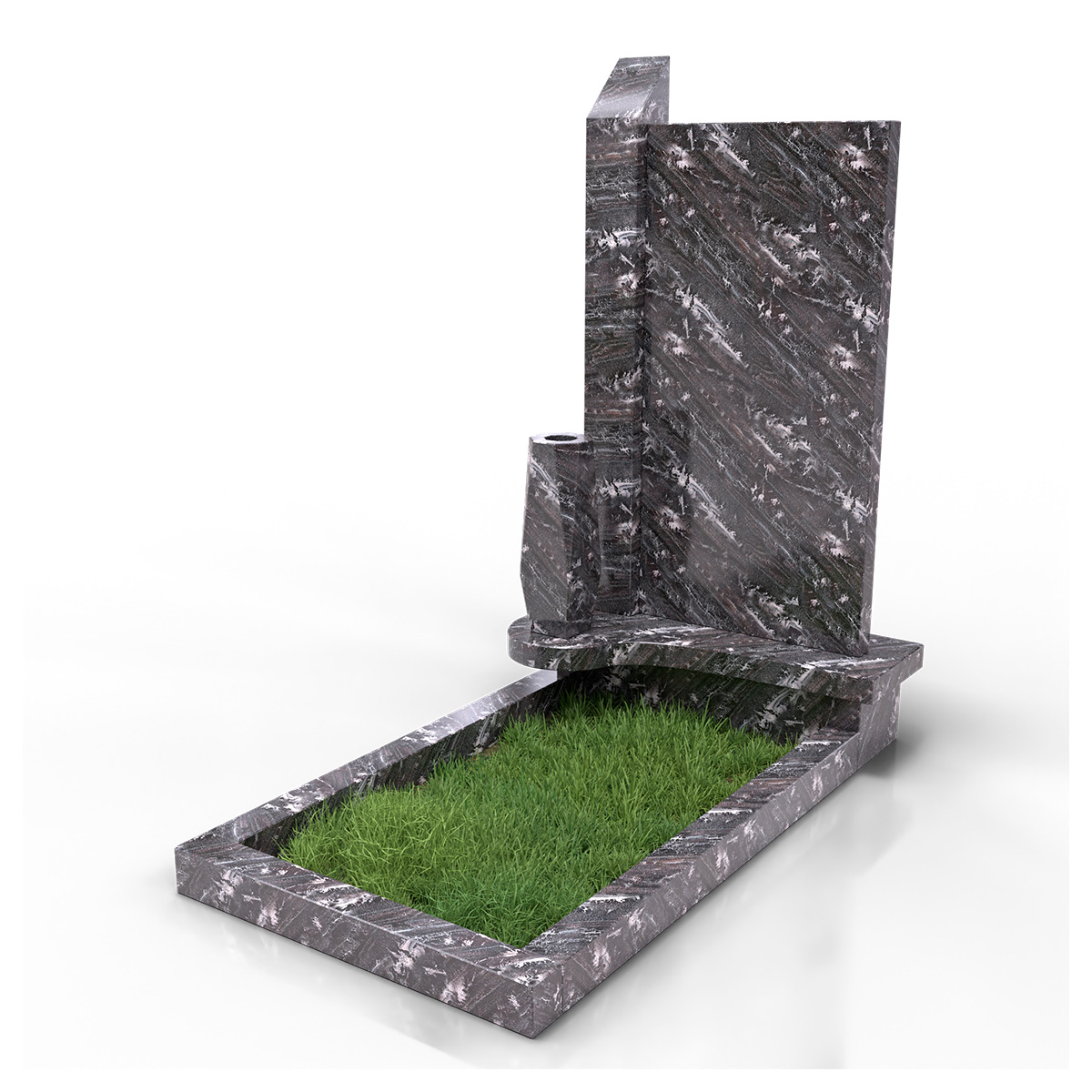 Комбинированный комплект «Гранатовый амфиболит КукД57» – элегантный памятник из гранита серых оттенков со светлыми прожилками с лаконичным и прочным дизайном. Прямые линии и вертикальные элементы стелы создают гармоничный силуэт, подчеркивая строгую красоту камня. Комплект дополнен цветником под зелень или гравий и декоративной вазой. Толщина 5 см позволяет памятнику быть устойчивым вариантом для благоустройства места памяти.