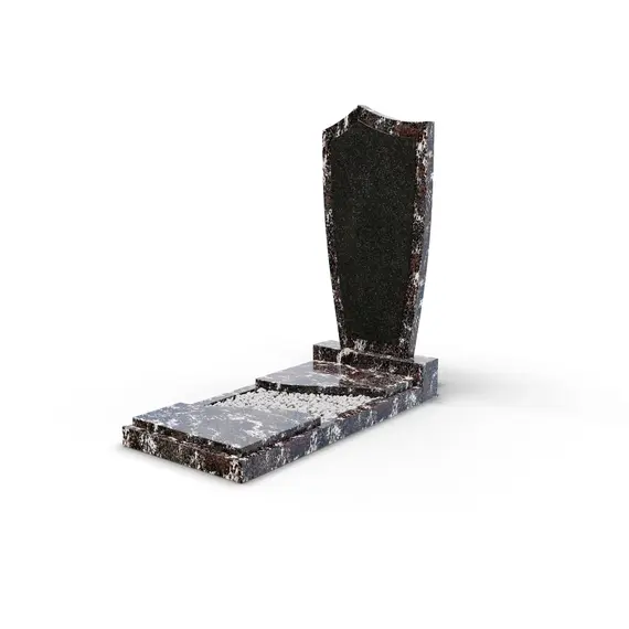 Комбинированный памятник «КукП4В Гранатовый амфиболит» – элегантное надгробие из камня с выразительными светлыми прожилками с контрастной черной вставкой из Габбро. Форма памятника напоминает щит с заостренной верхней частью. Основание выполнено из редкого гранита, а зона захоронения накрыта двумя короткими плитами. Прочная тумба шириной 60 см придает конструкции устойчивость к погодным условиям и сохранение эстетики на долгие годы. Идеальное сочетание классики и современного дизайна.