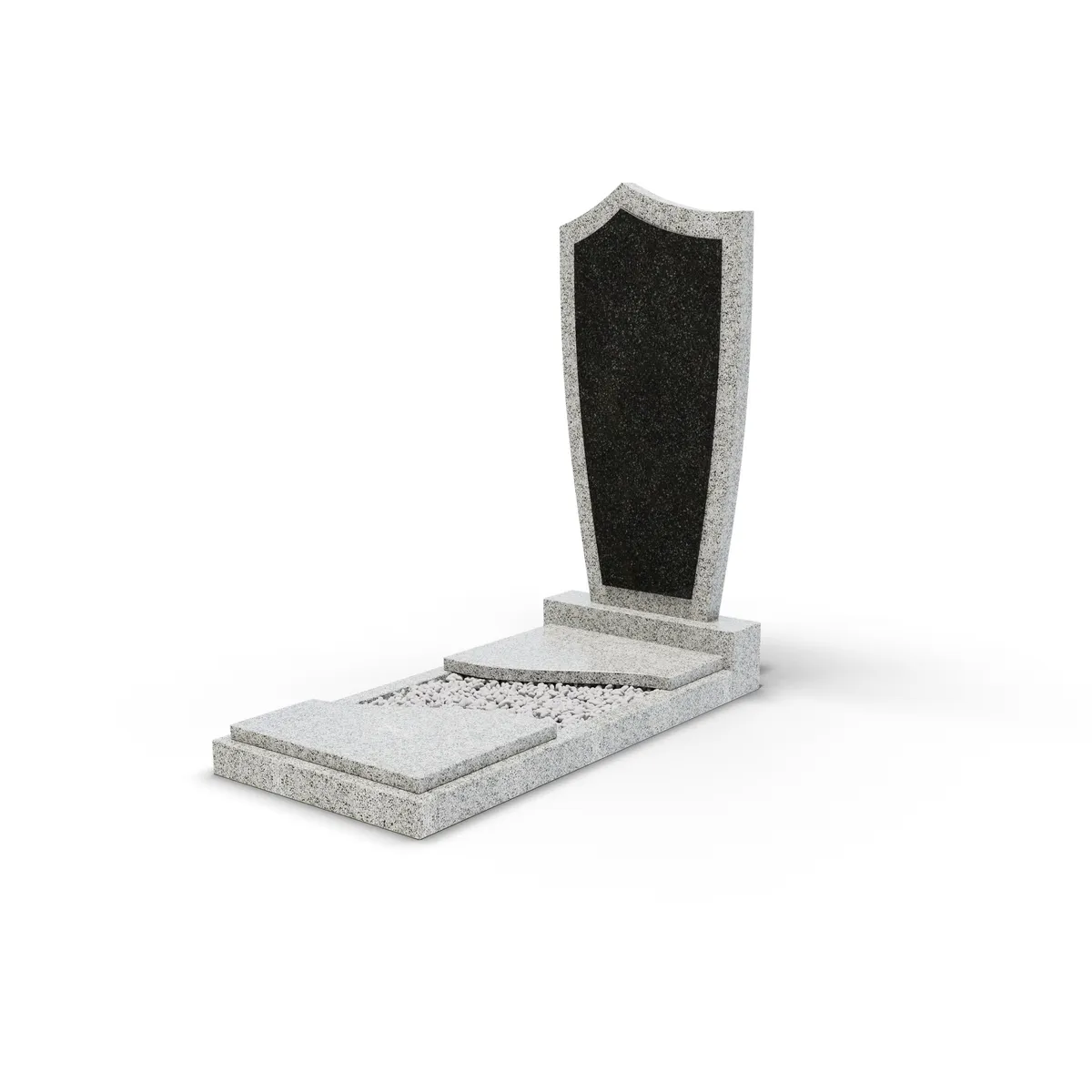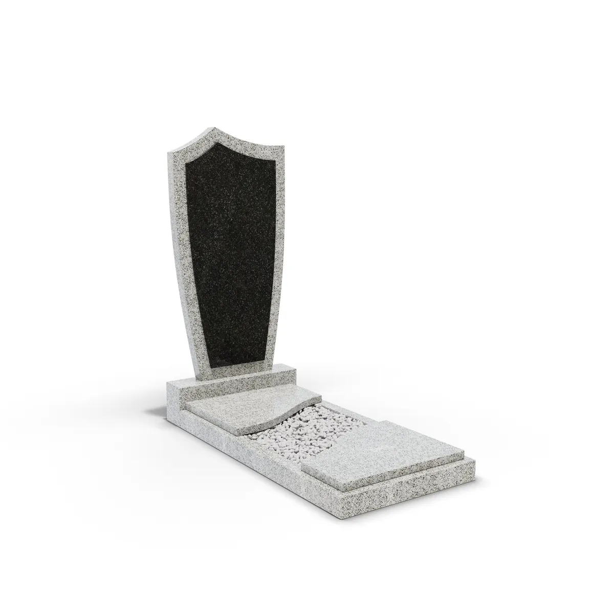 Комбинированный памятник «КукП4В Мансуровский» – элегантное надгробие из серого камня с контрастной черной вставкой из Габбро. Форма памятника напоминает щит с заостренной верхней частью. Основание выполнено из светлого гранита, а зона захоронения накрыта двумя короткими плитами. Прочная тумба шириной 55 см придает конструкции устойчивость к погодным условиям и сохранение эстетики на долгие годы. Идеальное сочетание классики и современного дизайна.