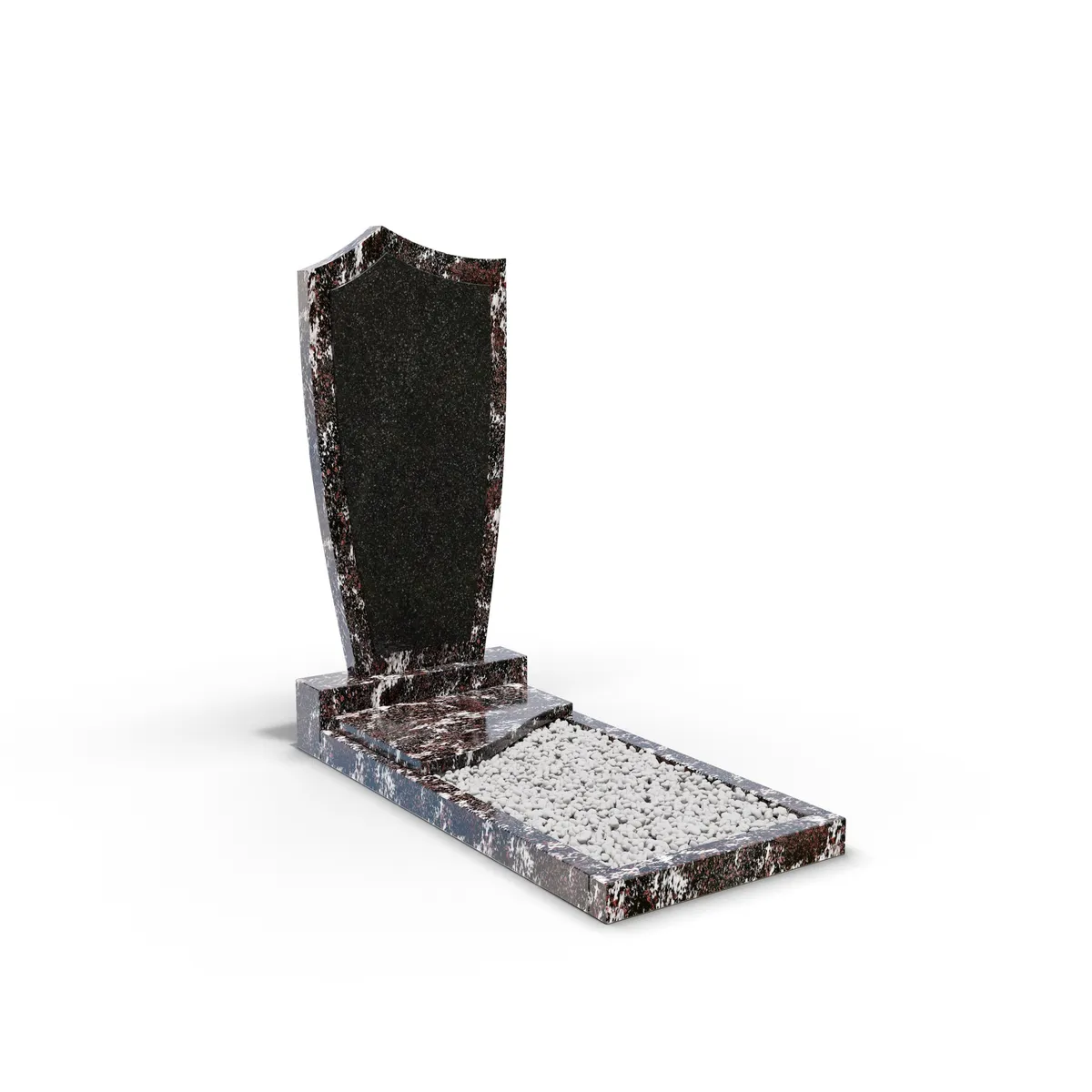 Комбинированный памятник «КукП4В Гранатовый амфиболит» – элегантное надгробие из камня с выразительными светлыми прожилками с контрастной черной вставкой из Габбро. Форма памятника напоминает щит с заостренной верхней частью. Основание выполнено из редкого гранита, а зона захоронения накрыта одной короткой плитой. Прочная тумба шириной 70 см придает конструкции устойчивость к погодным условиям и сохранение эстетики на долгие годы. Идеальное сочетание классики и современного дизайна.
