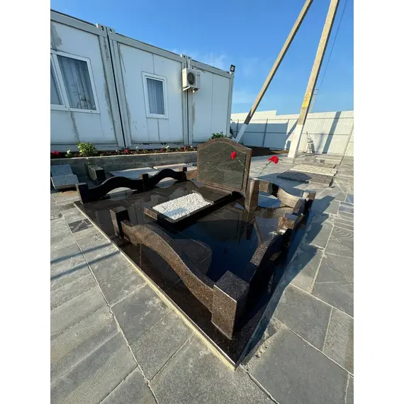 Комплекс из гранита «Елизовский К1» 250x200 – строгий и элегантный мемориальный памятник с геометрически выверенной композицией. Центральный элемент – горизонтальная гранитная стела с вставкой из темного габбро-диабаза, создающей выразительный контраст. В центре расположен аккуратный цветник, оформленный белым гравием. Постамент украшен плавными волнообразными элементами, смягчающими строгие линии. Цветовая гамма выполнена в оттенках коричневого (Исетский гранит), что придает комплексу глубину и сдержанную торжественность.