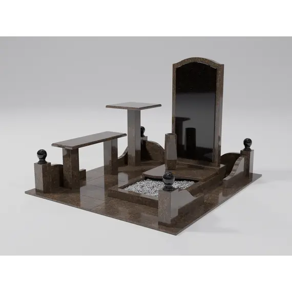 Комплекс из гранита «Елизовский К5» 180x200 – компактный и элегантный мемориальный комплекс с четкой геометрией и функциональными элементами. Главный акцент – вертикальная надгробная плита с плавными изгибами в верхней части, выполненная из темного гранита с вкраплениями. Вставка из габбро-диабаза придает памятнику выразительность и глубину. Комплекс дополнен удобной гранитной скамьей и небольшим столиком, создавая пространство для уединения и воспоминаний.