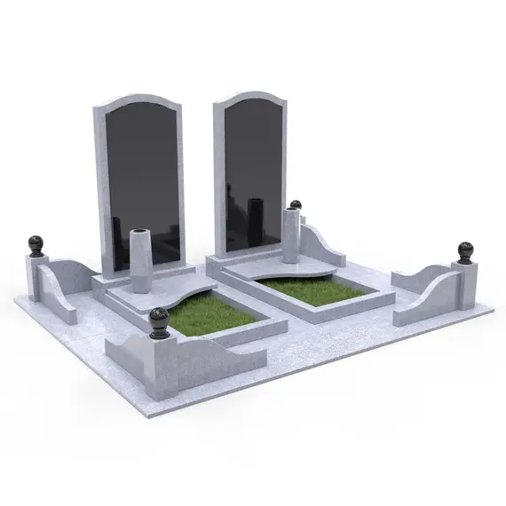 Комплекс из гранита «Исетский КукК7» 250x200 – двухместный мемориальный памятник, выполненный в строгом и элегантном стиле. Композиция представляет собой две светло-серые гранитные стелы с черными вставными плитами, установленные на изящно оформленном постаменте. Плавные линии, арочные элементы и симметричность создают гармоничную композицию. Черные плиты контрастируют со светло-серым гранитом, подчеркивая глубину и торжественность мемориала. Дополнительные элементы, такие как вазы и декоративные орнаменты, делают памятник завершенным и выразительным.