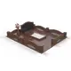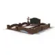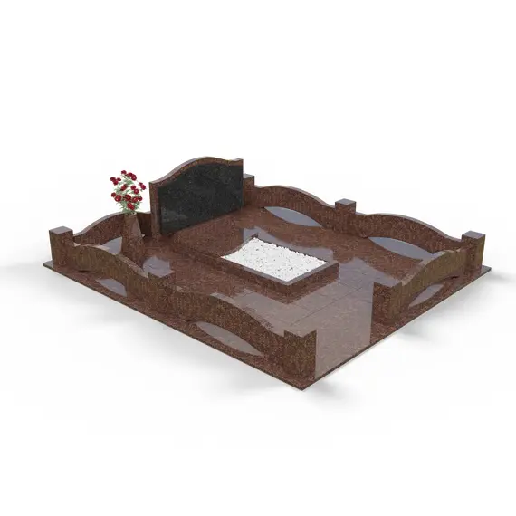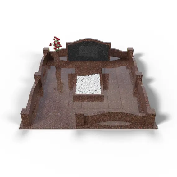 Комплекс из гранита «Елизовский К1» 250x200 – строгий и элегантный мемориальный памятник с геометрически выверенной композицией. Центральный элемент – горизонтальная гранитная стела с вставкой из темного габбро-диабаза, создающей выразительный контраст. В центре расположен аккуратный цветник, оформленный белым гравием. Постамент украшен плавными волнообразными элементами, смягчающими строгие линии. Цветовая гамма выполнена в оттенках коричневого (Исетский гранит), что придает комплексу глубину и сдержанную торжественность.