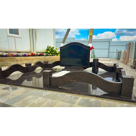 Комплекс из гранита «Елизовский К1» 250x200 – строгий и элегантный мемориальный памятник с геометрически выверенной композицией. Центральный элемент – горизонтальная гранитная стела с вставкой из темного габбро-диабаза, создающей выразительный контраст. В центре расположен аккуратный цветник, оформленный белым гравием. Постамент украшен плавными волнообразными элементами, смягчающими строгие линии. Цветовая гамма выполнена в оттенках коричневого (Исетский гранит), что придает комплексу глубину и сдержанную торжественность.