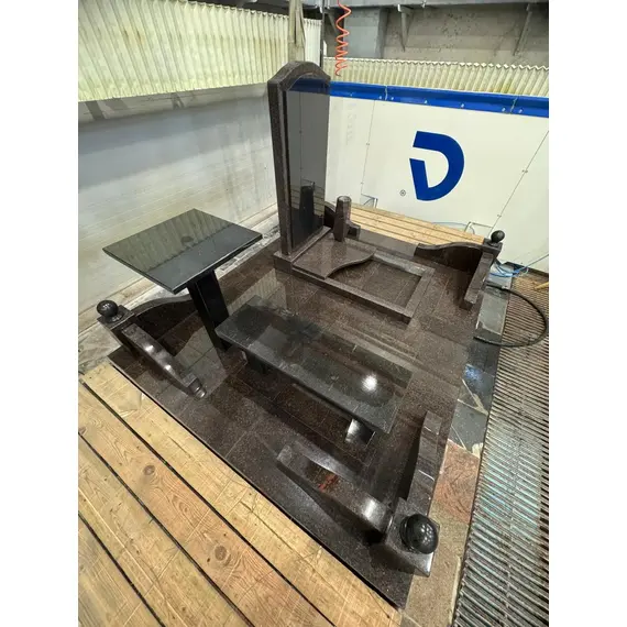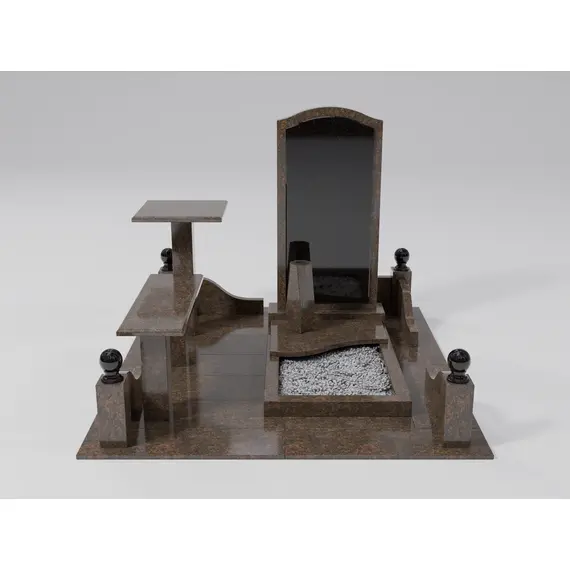 Комплекс из гранита «Елизовский К5» 180x200 – компактный и элегантный мемориальный комплекс с четкой геометрией и функциональными элементами. Главный акцент – вертикальная надгробная плита с плавными изгибами в верхней части, выполненная из темного гранита с вкраплениями. Вставка из габбро-диабаза придает памятнику выразительность и глубину. Комплекс дополнен удобной гранитной скамьей и небольшим столиком, создавая пространство для уединения и воспоминаний.