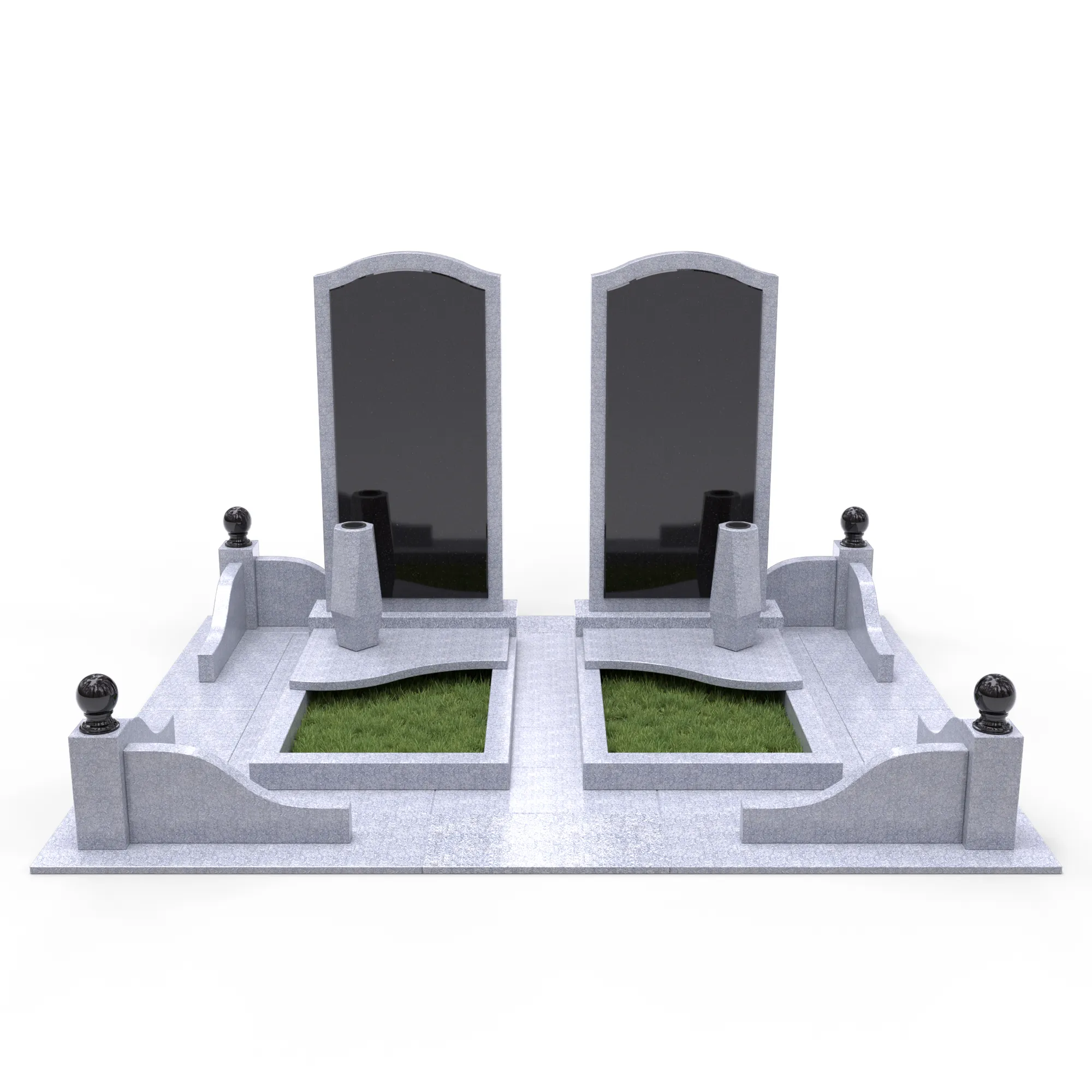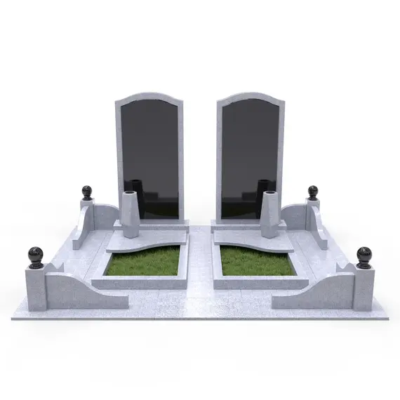 Комплекс из гранита «Исетский КукК7» 250x200 – двухместный мемориальный памятник, выполненный в строгом и элегантном стиле. Композиция представляет собой две светло-серые гранитные стелы с черными вставными плитами, установленные на изящно оформленном постаменте. Плавные линии, арочные элементы и симметричность создают гармоничную композицию. Черные плиты контрастируют со светло-серым гранитом, подчеркивая глубину и торжественность мемориала. Дополнительные элементы, такие как вазы и декоративные орнаменты, делают памятник завершенным и выразительным.