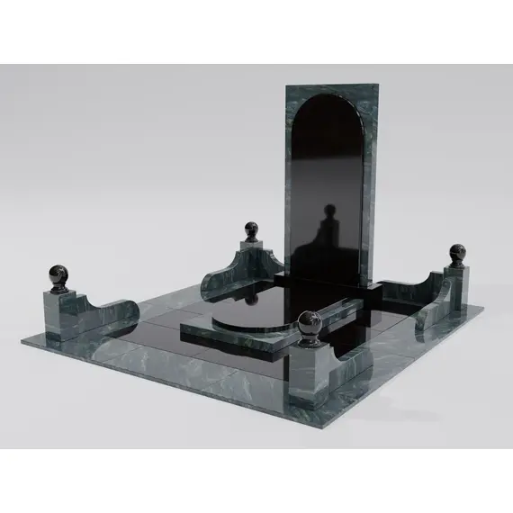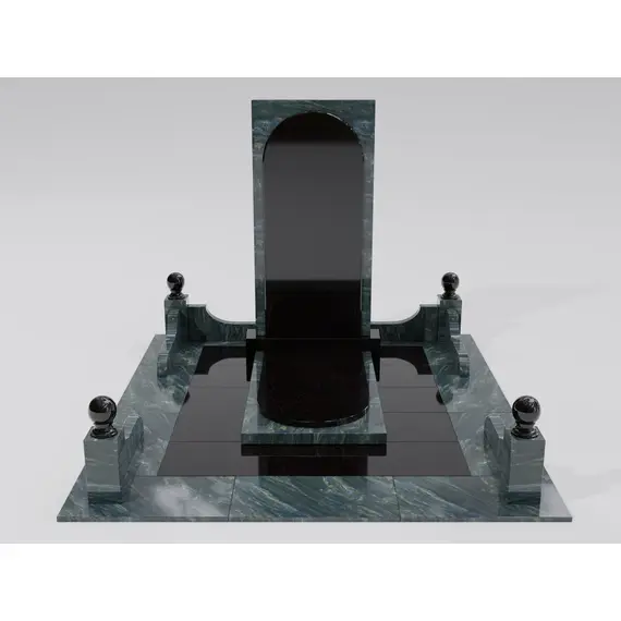 Комплекс «Саудо Грин + Габбро К9» 180x200 – элегантный мемориальный комплекс с выразительным сочетанием темного гранита и зеленоватого камня Саудо Грин. Центральный элемент – строгая прямоугольная стела из гранита Саудо Грин с черной вставкой из Габбро-диабаз. По бокам расположены небольшие сферические элементы, придающие памятнику сбалансированный вид. Основание выполнено в комбинированной гамме, создавая гармоничный контраст.