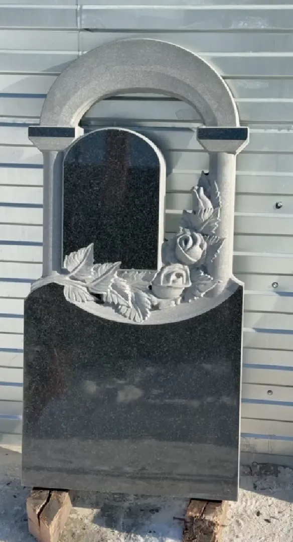 Комплект включает стелу размером 120×60×7 см, тумбу 70×20×12 см и цветники: два – 100×7×5 см и один – 70×7×5 см (закладная), что образует гармоничную композицию с прямоугольной основой и арочной верхней частью. По бокам стелы выполнена детализированная резьба в виде роз и листьев, создающая выразительное обрамление и подчеркивающая центральную часть памятника. Точная резьба, рельефная обработка и сбалансированное расположение элементов придают изделию объем и трехмерность.