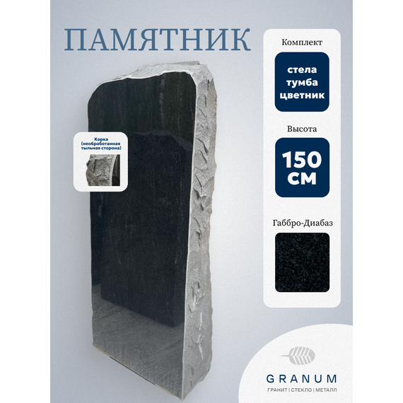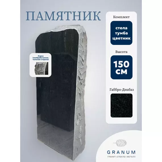 Памятник корка Габбро-Диабаз гранит с необработанной тыльной стороной, благодаря своим свойствам, является материалом премиум класса. Не имеет вредных примесей, не радиоактивен и имеет низкое влагопоглощение