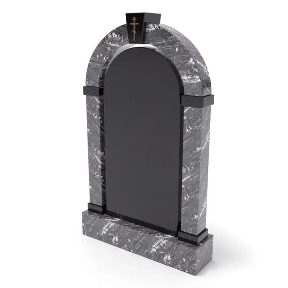 Комплект «АРКАДИЯ» (Гранатовый амфиболит/Габбро) без цветника – строгий и элегантный мемориальный комплект, выполненный из редкого гранатового амфиболита с выразительными светлыми прожилками, гармонично сочетающегося с глубоким черным габбро. Главный элемент – арочная стела с крестообразным украшением в верхней части, придающая памятнику величественный облик. Симметричный дизайн и минималистичный стиль делают этот памятник достойным выбором для создания места памяти. Высококачественная обработка гранита обеспечивает долговечность и эстетичность.