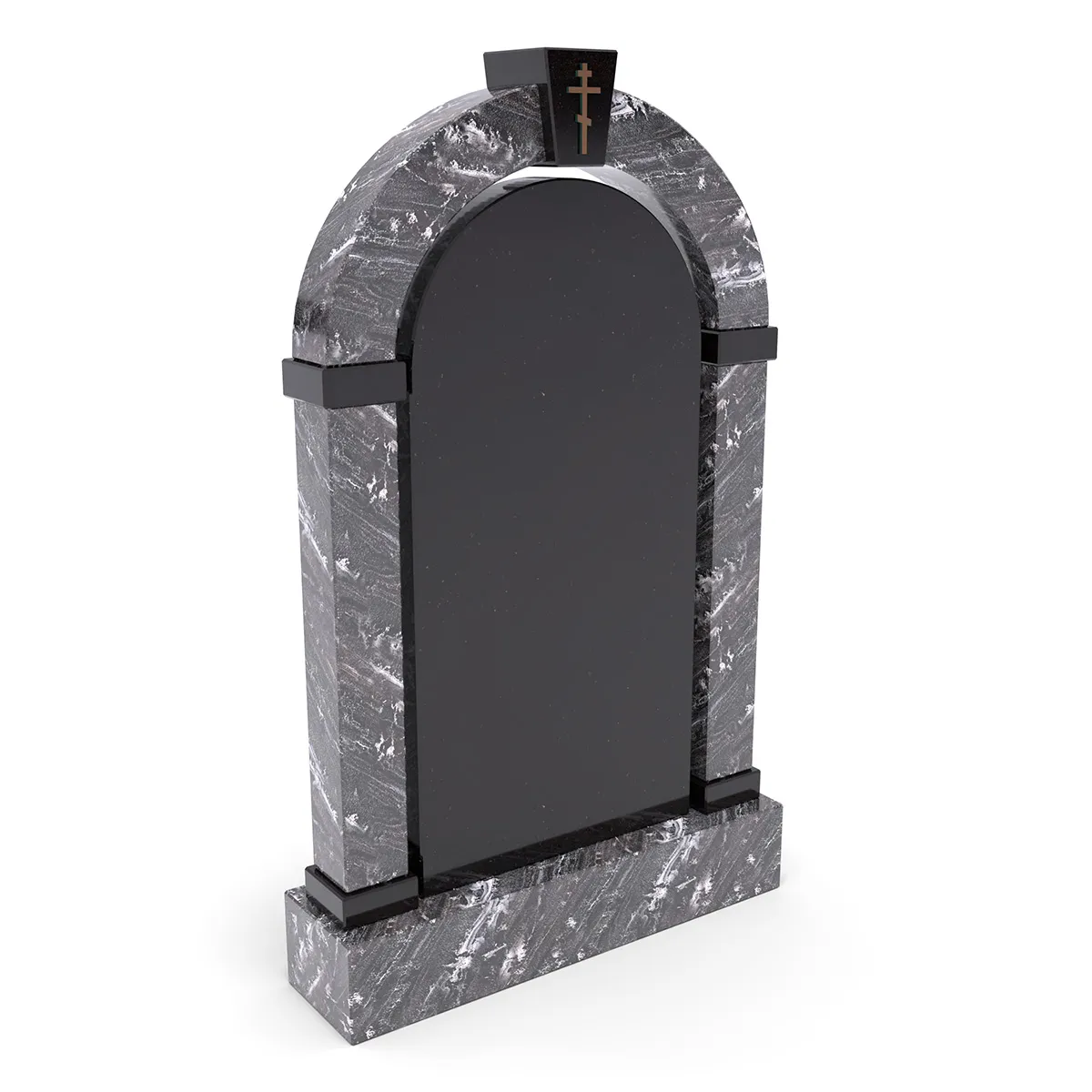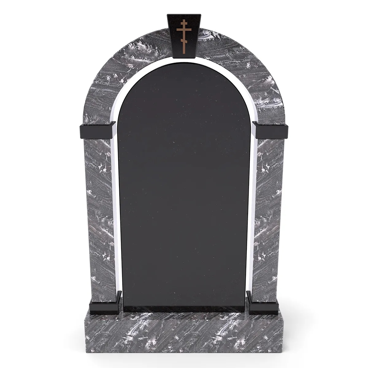 Комплект «АРКАДИЯ» (Гранатовый амфиболит/Габбро) без цветника – строгий и элегантный мемориальный комплект, выполненный из редкого гранатового амфиболита с выразительными светлыми прожилками, гармонично сочетающегося с глубоким черным габбро. Главный элемент – арочная стела с крестообразным украшением в верхней части, придающая памятнику величественный облик. Симметричный дизайн и минималистичный стиль делают этот памятник достойным выбором для создания места памяти. Высококачественная обработка гранита обеспечивает долговечность и эстетичность.