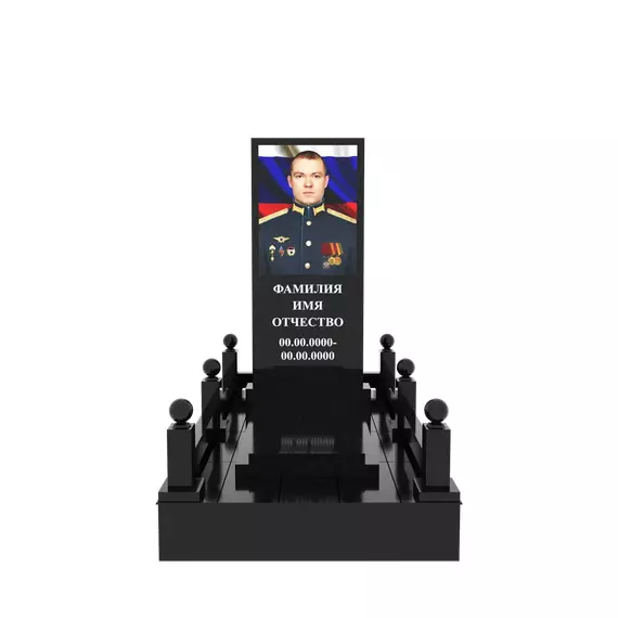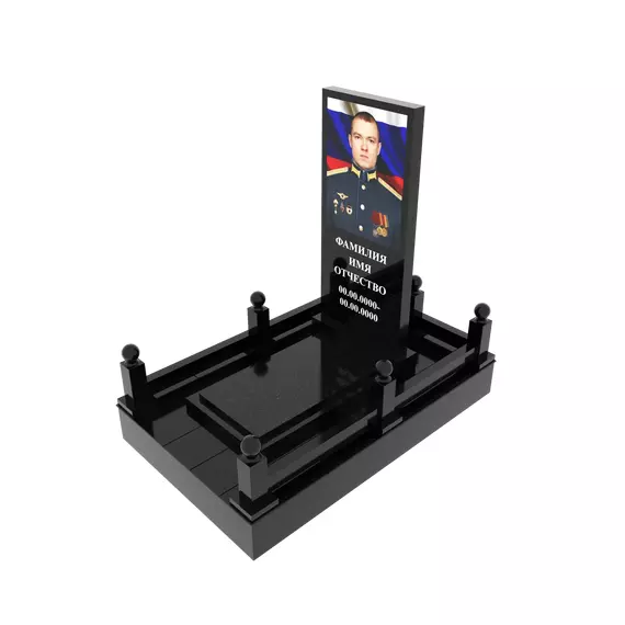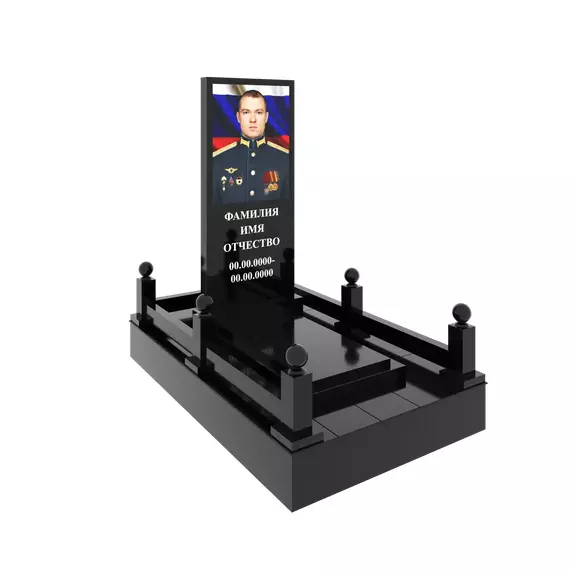 Гранитный подиум 150 × 250 см, высота 30 см, стеклянный портрет полурост, столбики и шары