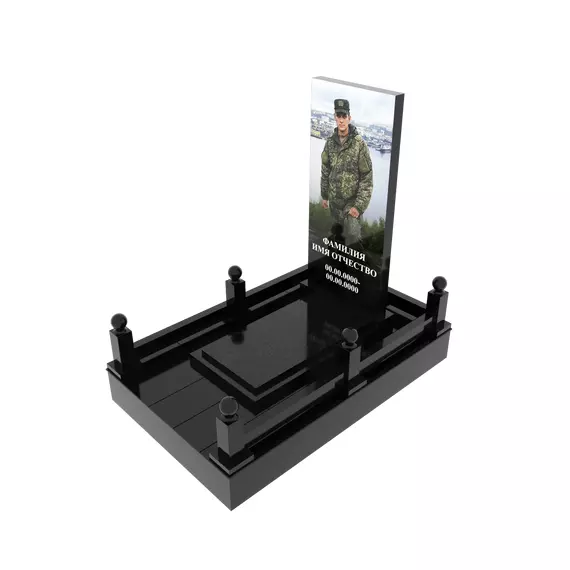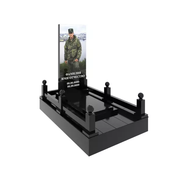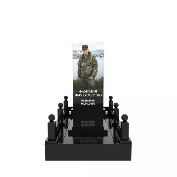 Гранитный подиум 150 × 240 см, высота 30 см, стеклянный портрет в полный рост, столбики и шарики
