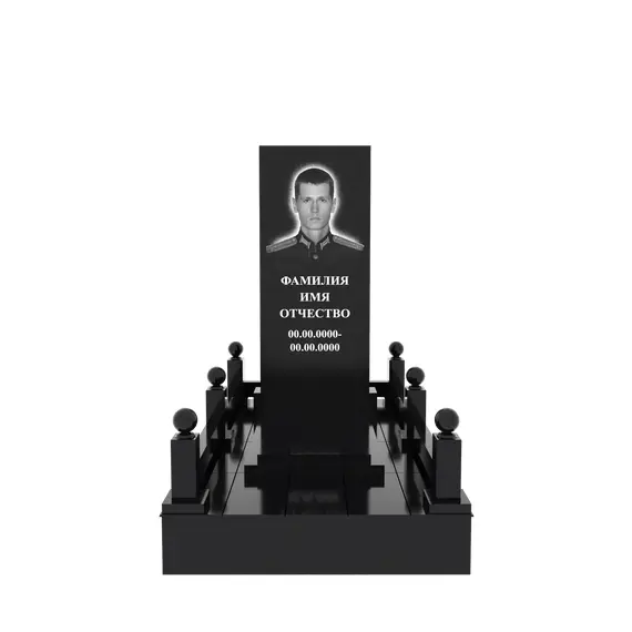 Гранитный подиум 150 × 240 см, высота 30 см, гравировка полурост, столбики и шары