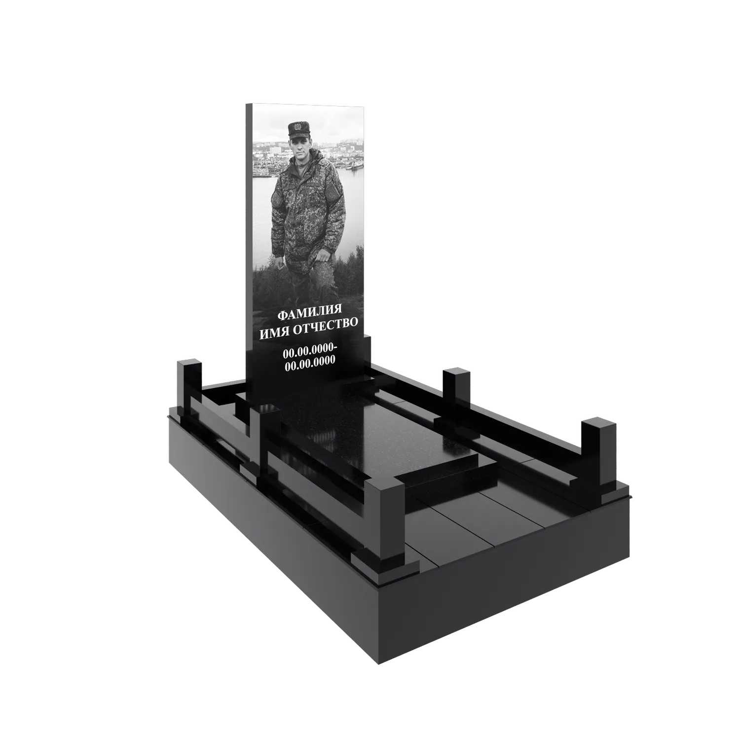 Гранитный подиум 150 × 240 см, высота 30 см, гравировка портрета в полный рост, столбики и перемычки