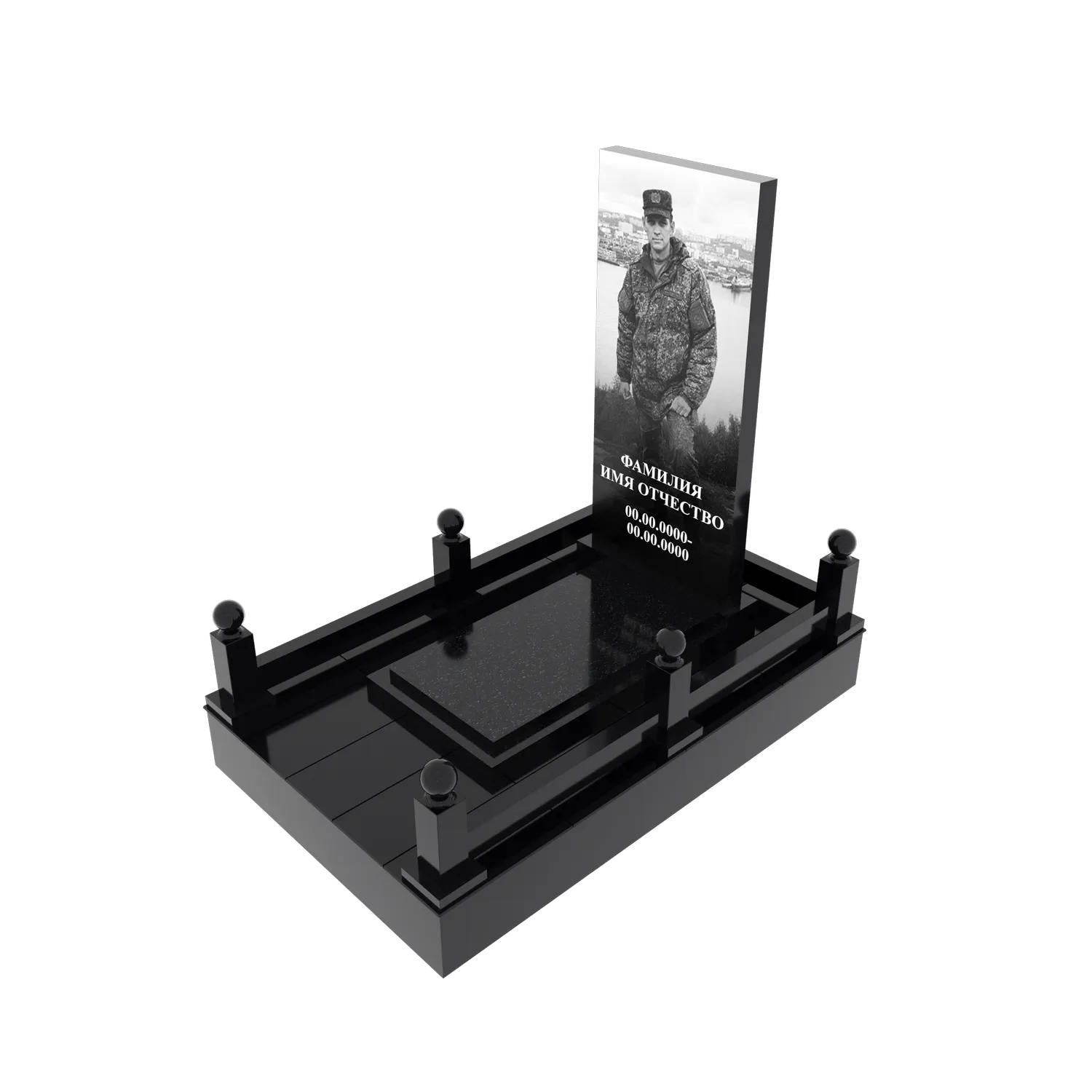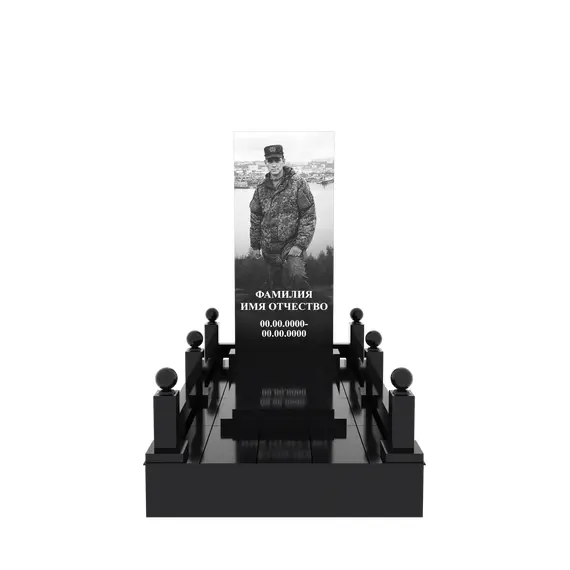 Гранитный подиум 150 × 240 см, высота 30 см, гравировка портрета в полный рост, столбики и шарики