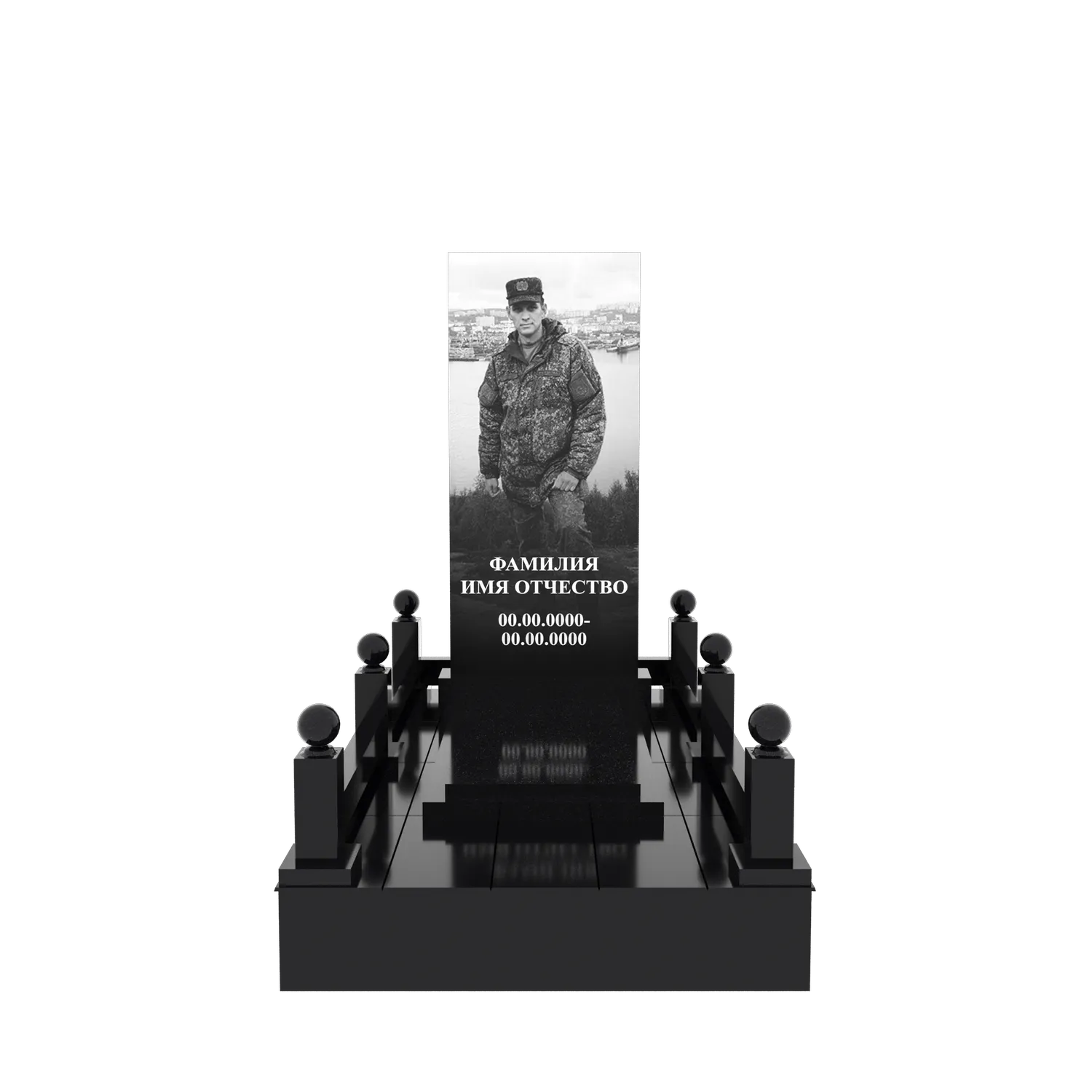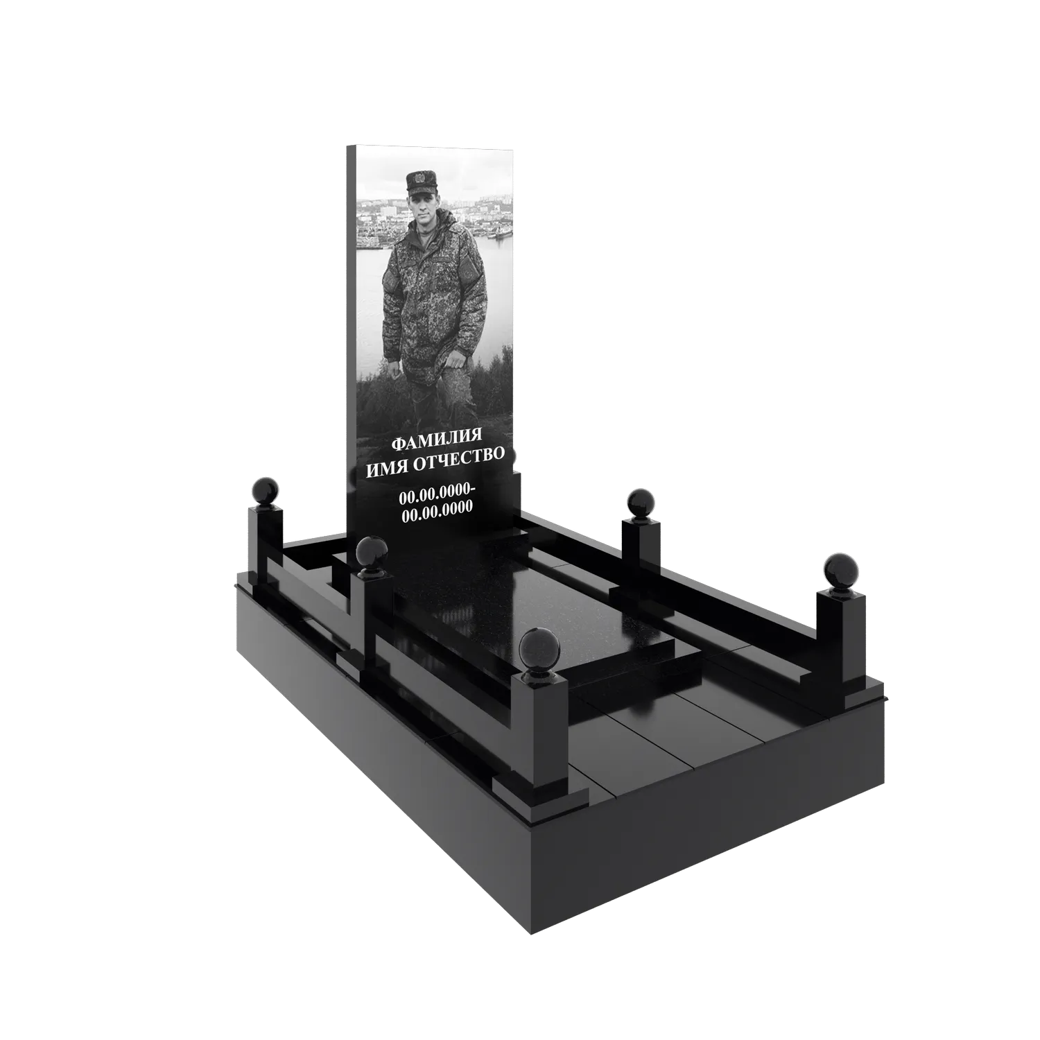 Гранитный подиум 150 × 240 см, высота 30 см, гравировка портрета в полный рост, столбики и шарики
