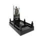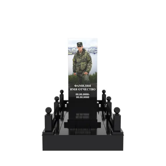 Гранитный подиум 150 × 240 см, высота 30 см, стеклянный портрет в полный рост, столбики и шарики