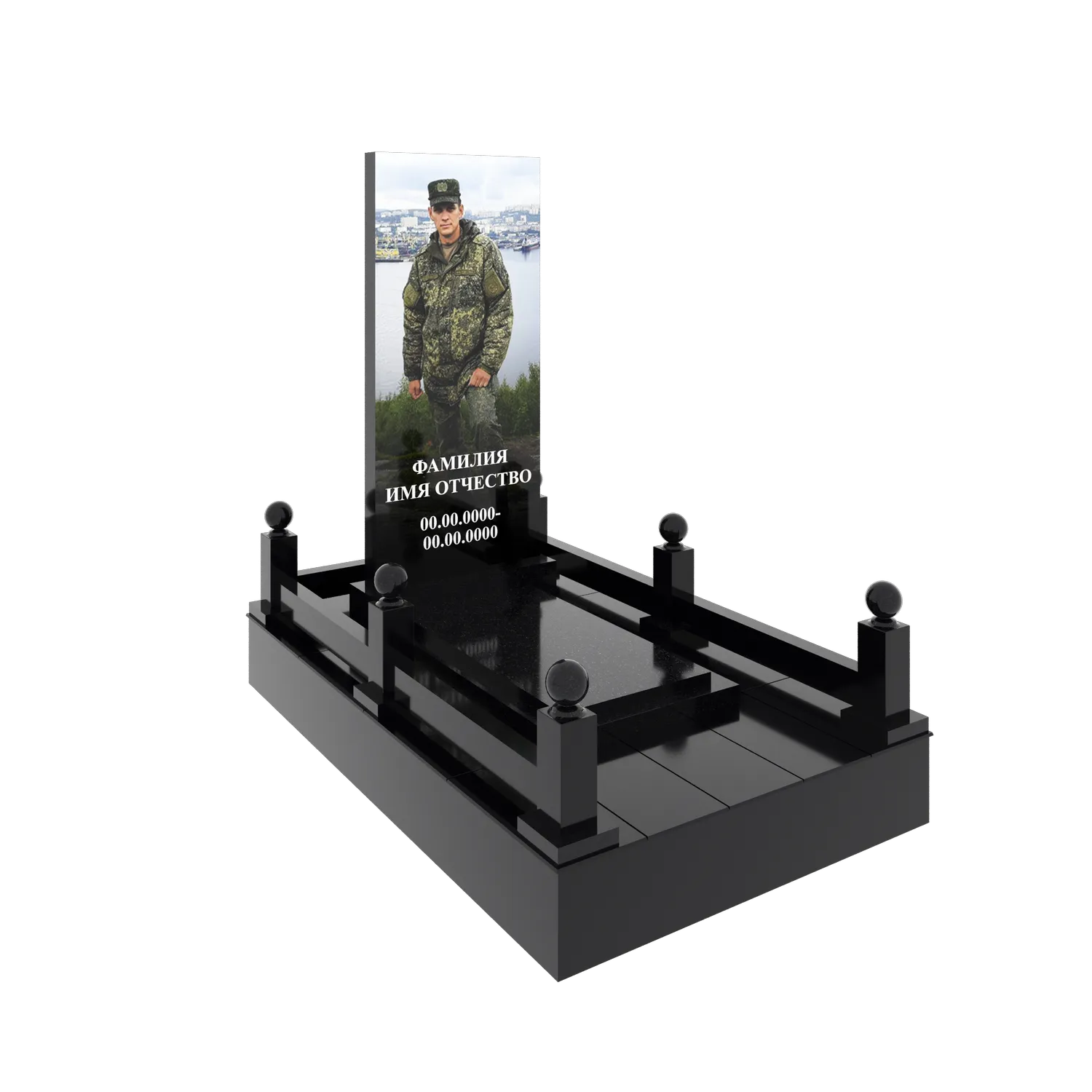 Гранитный подиум 150 × 240 см, высота 30 см, стеклянный портрет в полный рост, столбики и шарики
