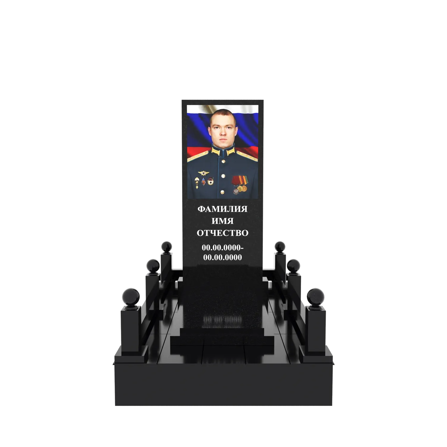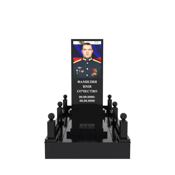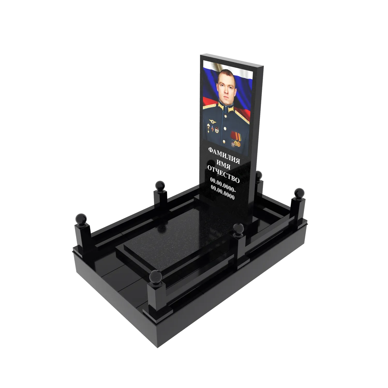 Гранитный подиум 150 × 250 см, высота 30 см, стеклянный портрет полурост, столбики и шары