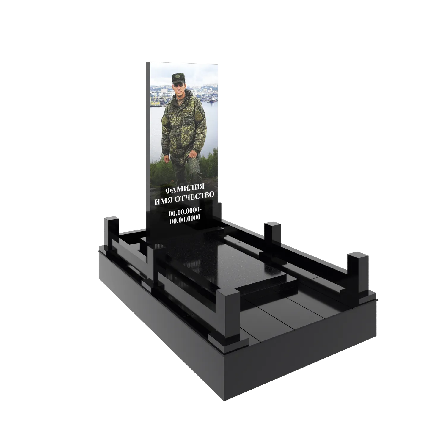 Гранитный подиум 150 × 250 см, высота 30 см, стеклянный портрет в полный рост, столбики и перемычки