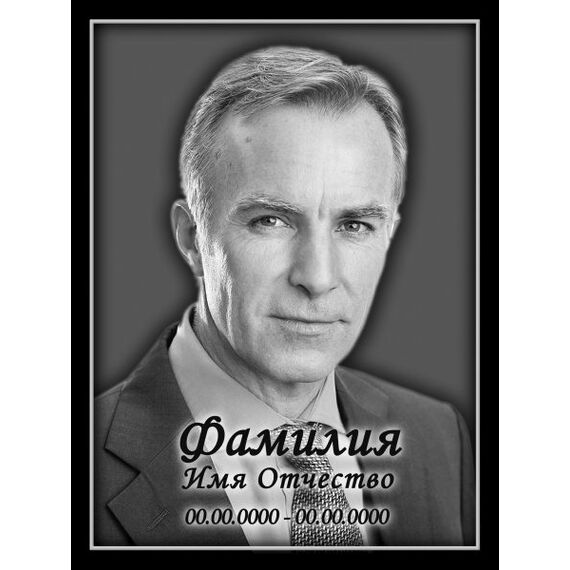 Прямоугольный (вертикальный) портрет в рамке с надписью в рамке изготавливается на стекле по специальной технологии с обжигом. Изделие проходит цикл обжига при температуре 600*С.